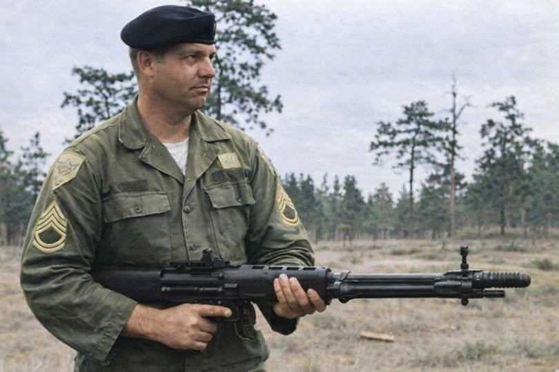US Army Green Beret conducts a live fire test with a captured Viet Cong WW2 era German made FG-42 Falschimjaeger Gewehr that was previously captured by the Soviets which in turn was send over to North Vietnam as military aid during the conflict sometimes in the late 1950s.