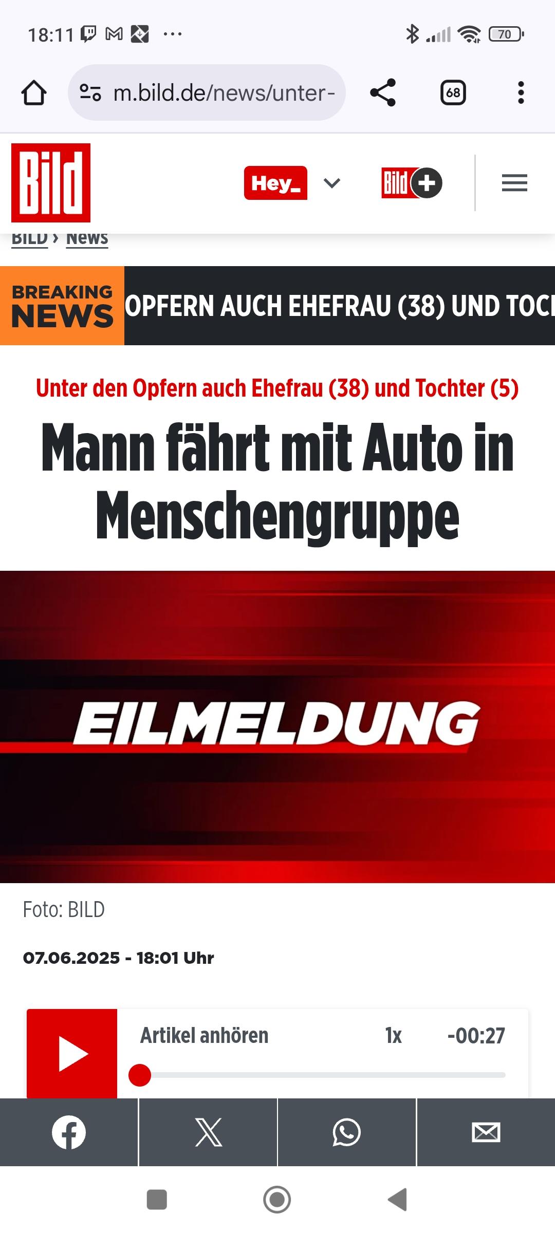 gbadmin Posted June 8, 2025 at 01:12 PM Posted June 8, 2025 at 01:12 PM Am Samstag war ein Autofahrer in Passau in eine Menschengruppe gefahren - inzwischen wurde Haftbefehl beantragt. Unter den Verletzten sind auch Frau und Tochter des 48-Jährigen. Auslöser war womöglich ein Sorgerechtsstreit.[mehr]Gesamten Artikel anzeigen
