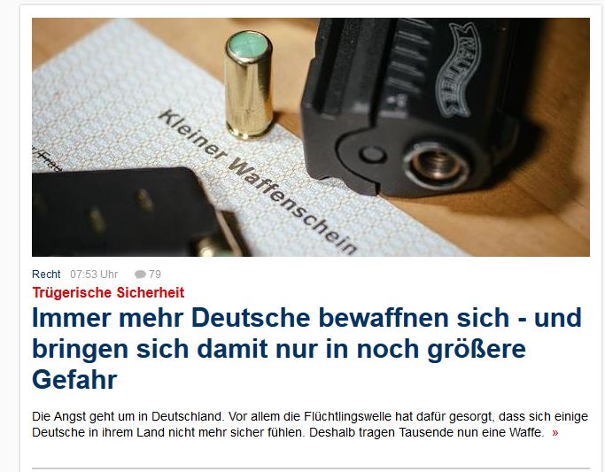 Jägermeister Geschrieben Februar 11, 2017 at 16:08 Geschrieben Februar 11, 2017 at 16:08 Zitat Angst vor Terror und rechtspopulistische Stimmungsmache spiegeln sich in einer beunruhigenden Statistik wider: 4413 kleine Waffenscheine wurden im vergangenen Jahr in Berlin genehmigt, das sind 500 Prozent mehr als 2015. Deutschlandweit ist der Schreckschusswaffenbesitz um 50 Prozent gestiegen. Das macht mir Angst! http://www.focus.de/politik/deutschland/kommentar-zu-waffenkaeufen-immer-mehr-deutsche-bewaffnen-sich-ihr-macht-mir-angst_id_6615688.html